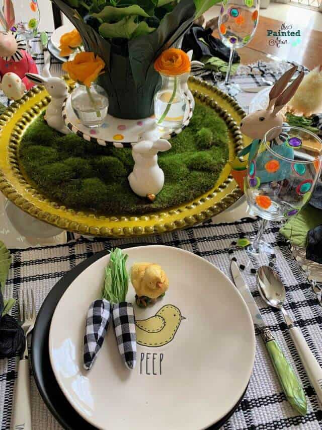 This peep themed Easter tablescape blends my favorite buffalo check with pops of bright green using moss in a pretty centerpiece. I'm loving those DIY carrots!