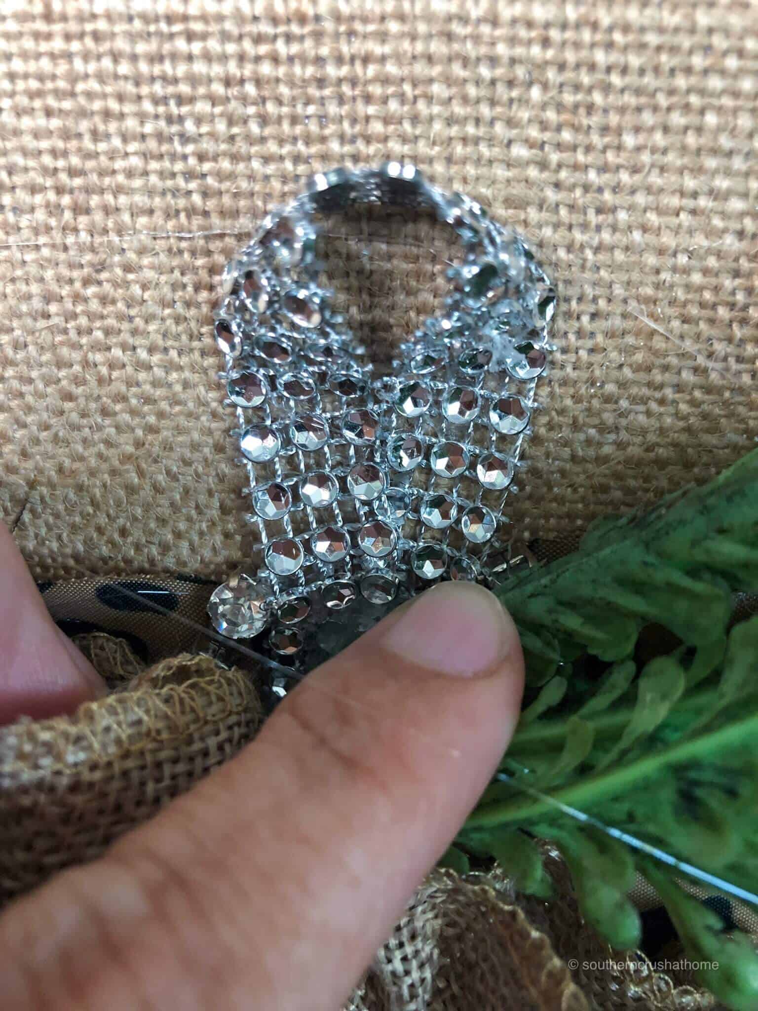Using a scrap piece of rhinestone ribbon, I fashioned a stem and glued it to the top of the pumpkin.A Fabric stem for DIY Pumpkin