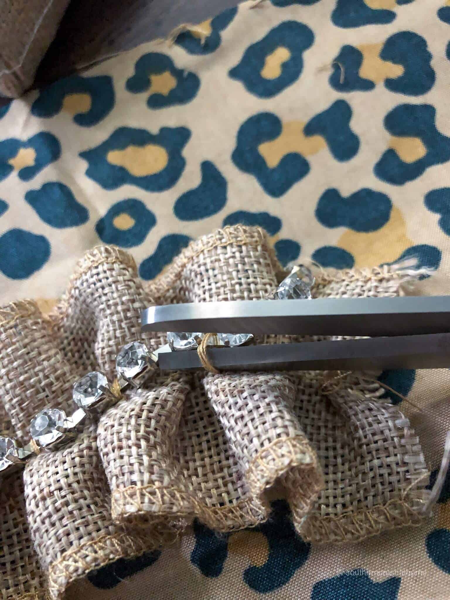 Next, I separated the rhinestone trim from the ribbon it came on and cut it into four strips to fit my pumpkin shape. Cutting rhinestones into strips