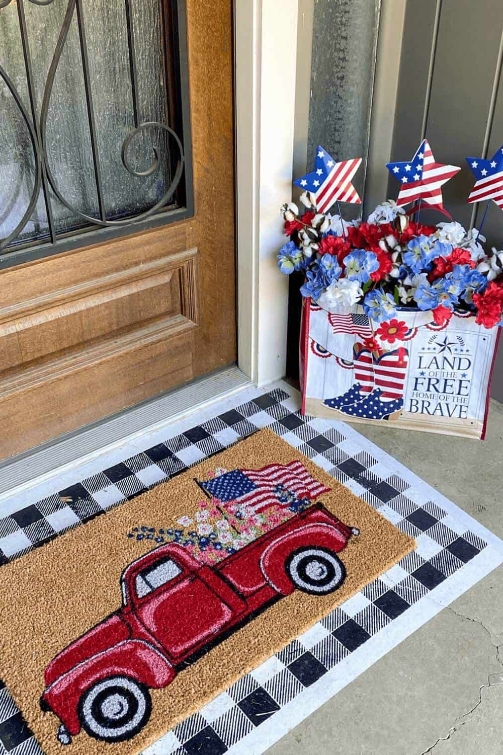This turned out so cute I thought and plan to use this same concept to decorate for the different seasons! It would look so good with a Christmas, Easter, Halloween or Fall bag as well, don't you think? I paired it with this coordinating Summer little red truck patriotic doormat that is covering my hand-painted buffalo check doormat! If you missed the tutorial on the buffalo check mat, you can find it here!