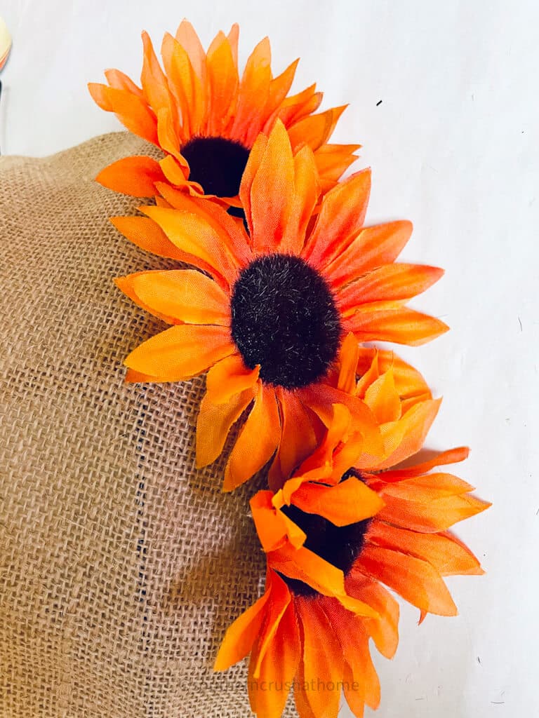 - Using wire cutters, cut the sunflowers from their stem and leave about an inch to an inch and a half of the original stem. Add hot glue to the backside of the flower and push the stem through the burlap fabric (use the holes already in the fabric). Repeat this process to cover the entire pumpkin wreath form. It should take the entire 10 bunches of sunflowers.