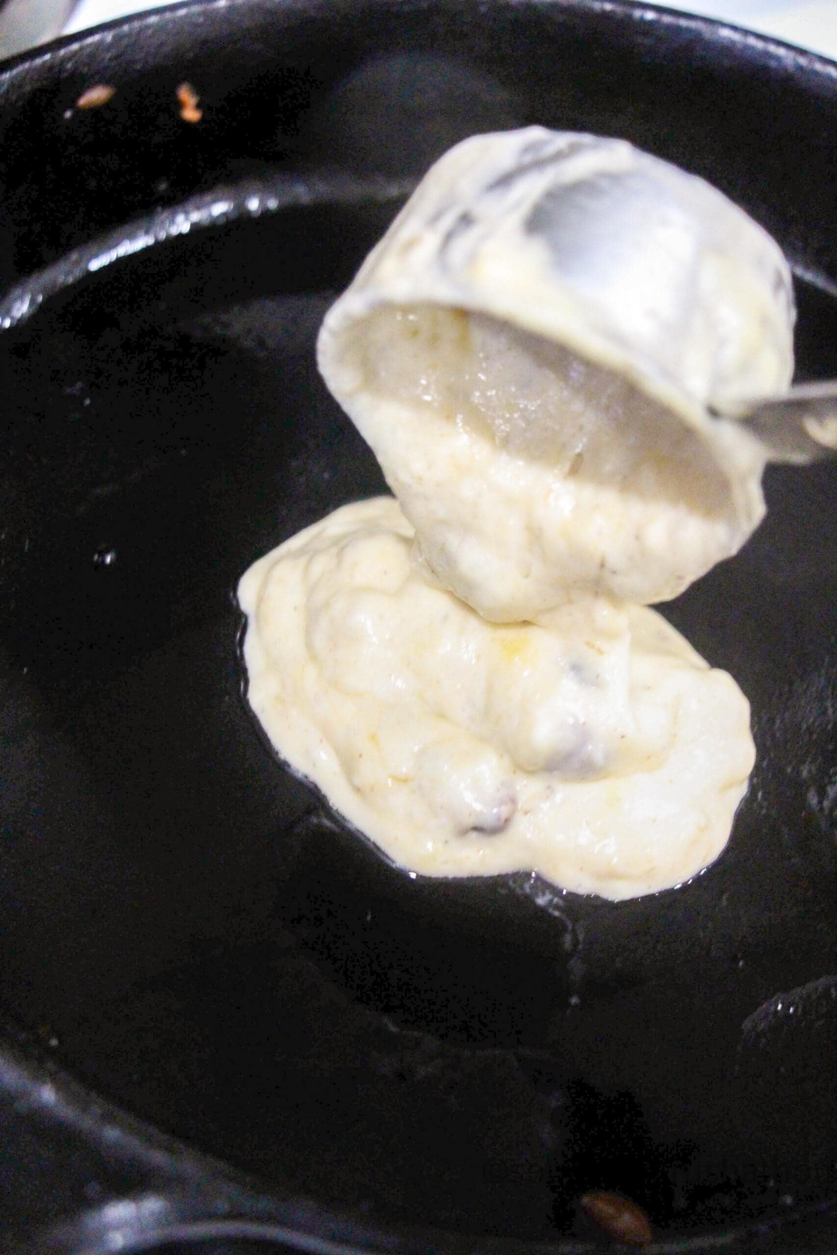 - Place a skillet over medium-high heat and brush with oil. Once the skillet is hot, reduce the heat to medium-low and scoop 1/3 cup banana pecan pancake batter onto the skillet.