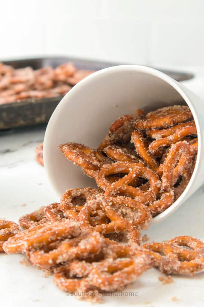 Though these cinnamon sugar pretzels are great on their own they can be added to your favorite trail mix, served alongside a bowl of ice cream or yogurt, or crushed and used as a sprinkle on cookies, cakes, or brownies.