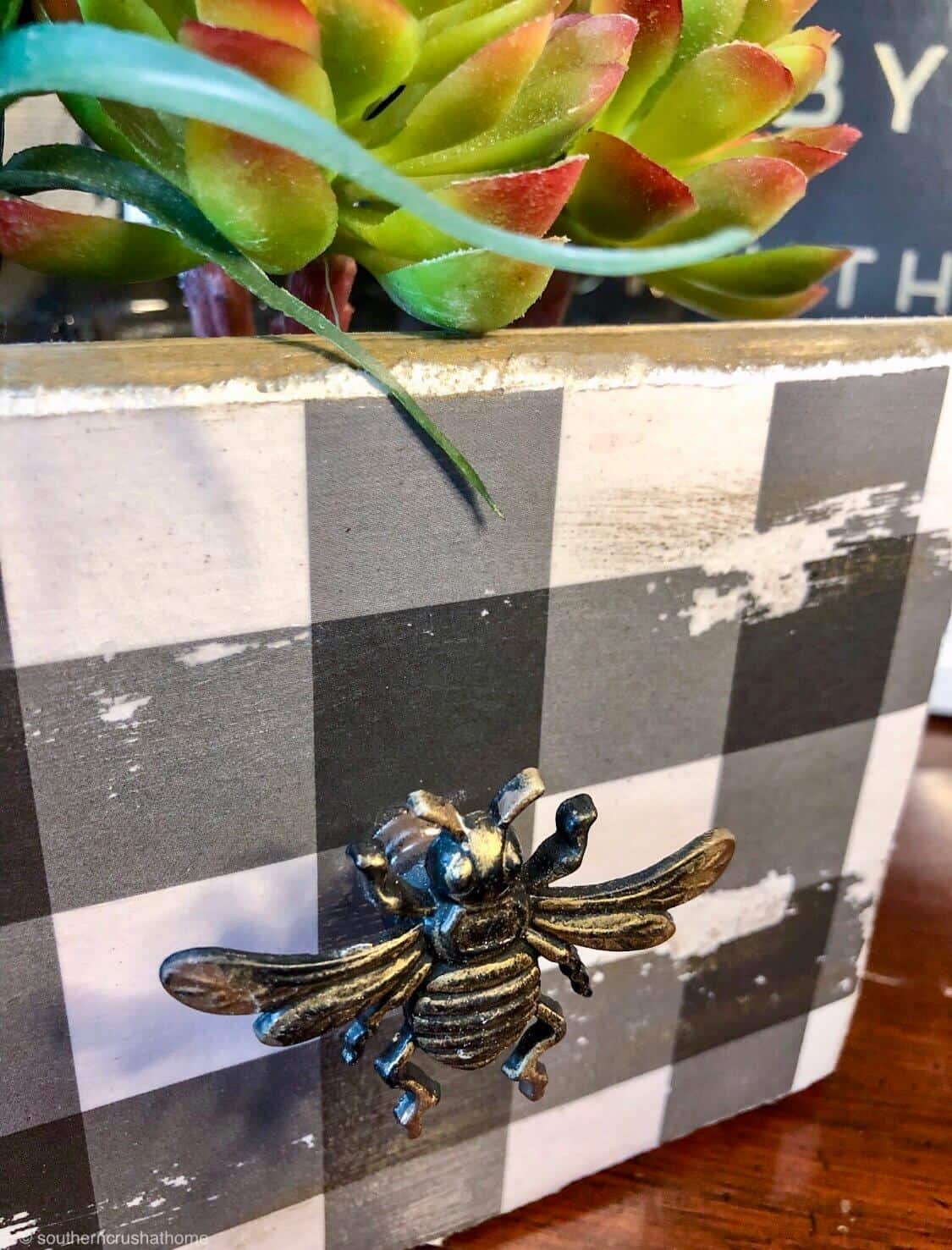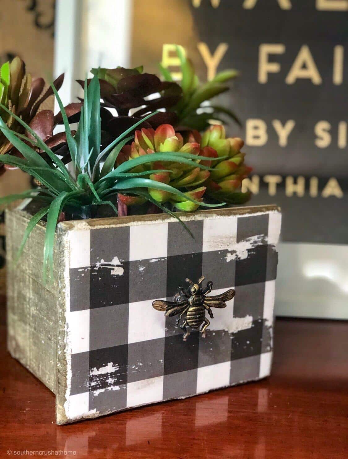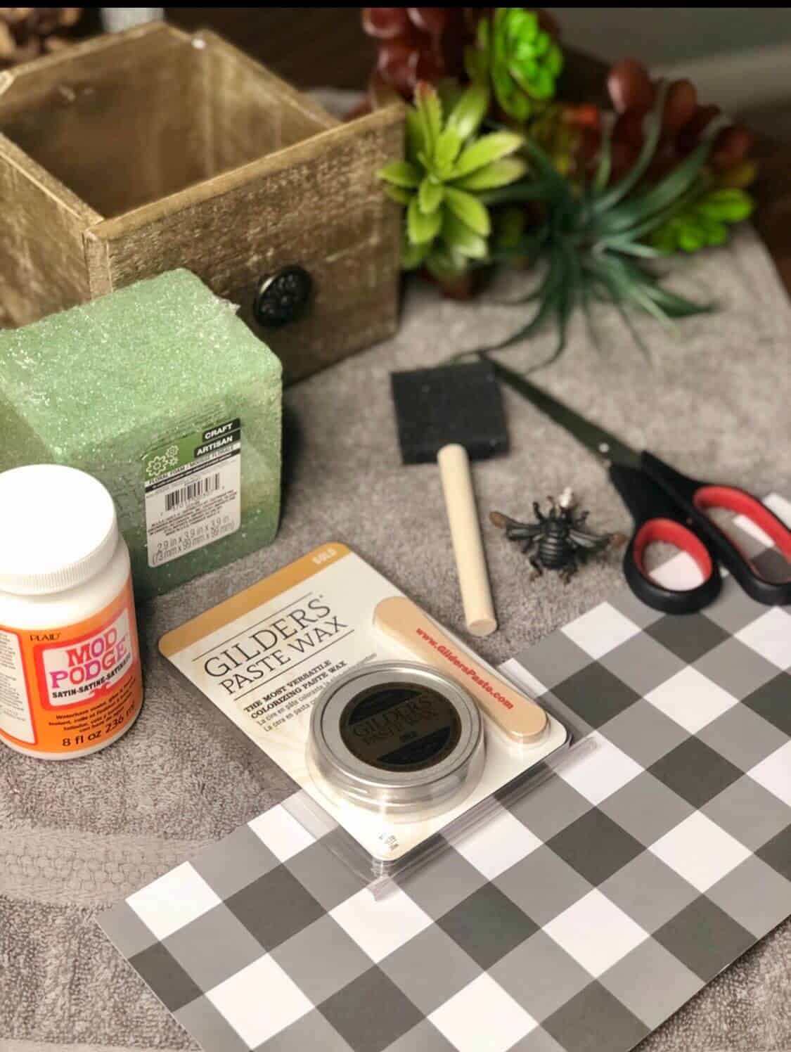 I found the cutest wooden drawer at a local garage sale that came complete with a plastic planter liner already inside. Being that I do not have a green thumb on either hand, I knew right away I wanted to re-purpose this into something cute and faux! This DIY buffalo check decoupage project was the perfect solution…