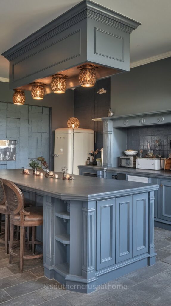 The walls and cabinetry feature different tones, from soft light grey to a deeper slate. This design adds depth and interest without overwhelming the space. The choice of a retro blue fridge adds a touch of personality, standing out while still fitting into the overall grey palette.