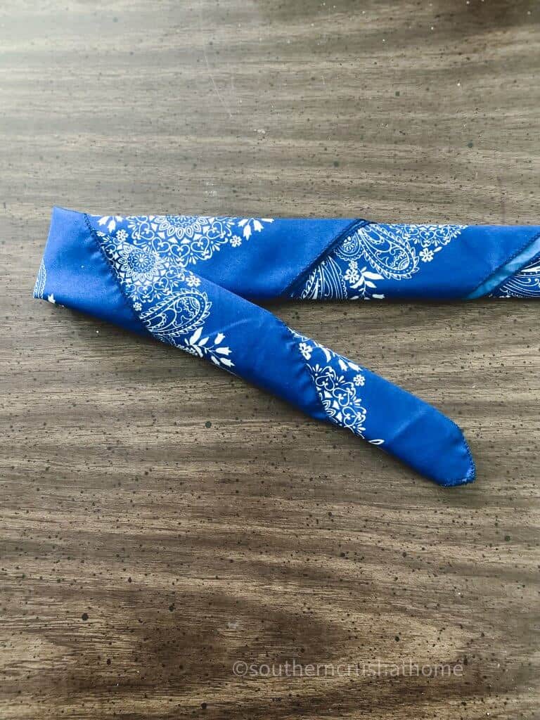- Open the bandana and slowly roll it from one end to the point on the opposite side.