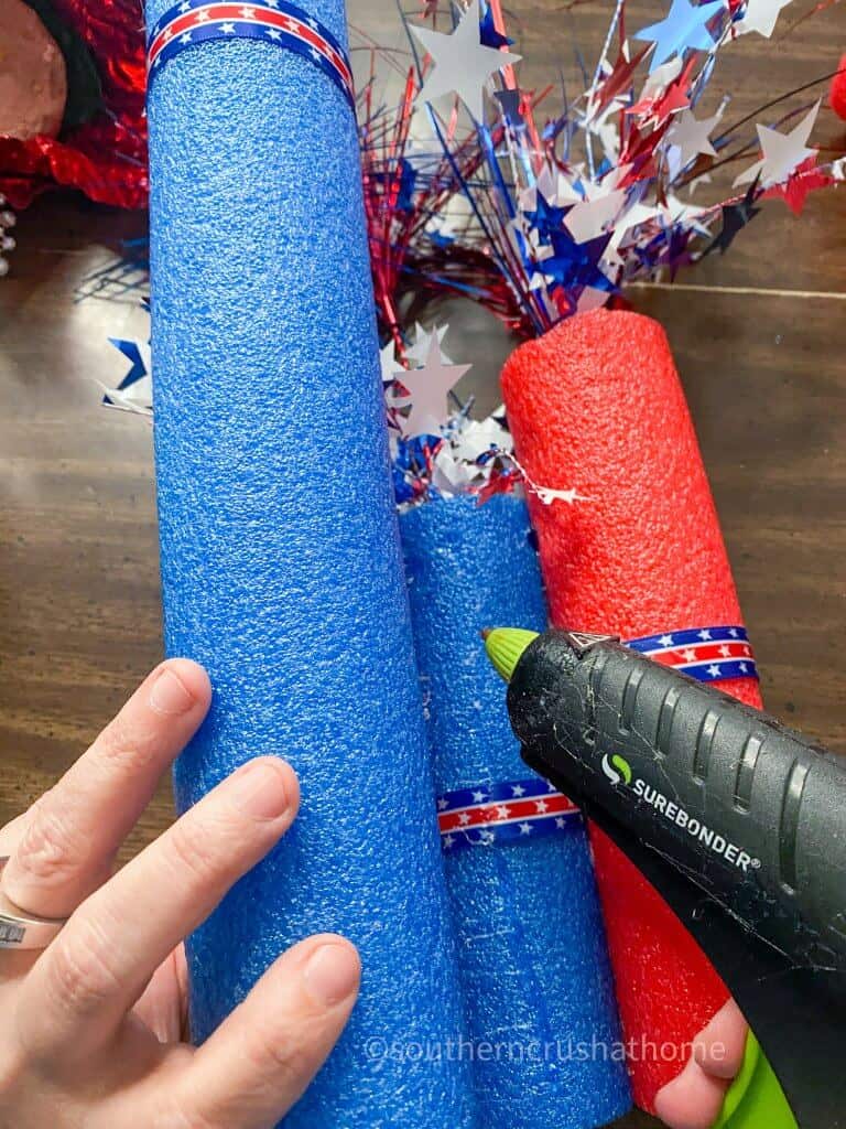 Use your hot glue gun to secure the firecrackers together. Add pretty patriotic ribbon again using your hot glue gun.