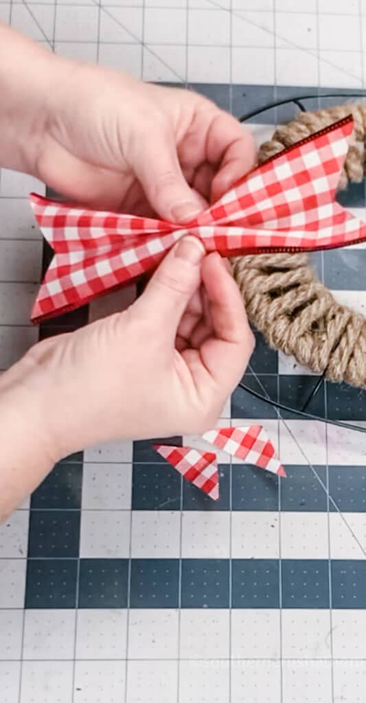 - Once you have finished wrapping the rope on the wreath form, you want to cut the gingham ribbon into short pieces about 3" long. Cut the ends with a dovetail cut.