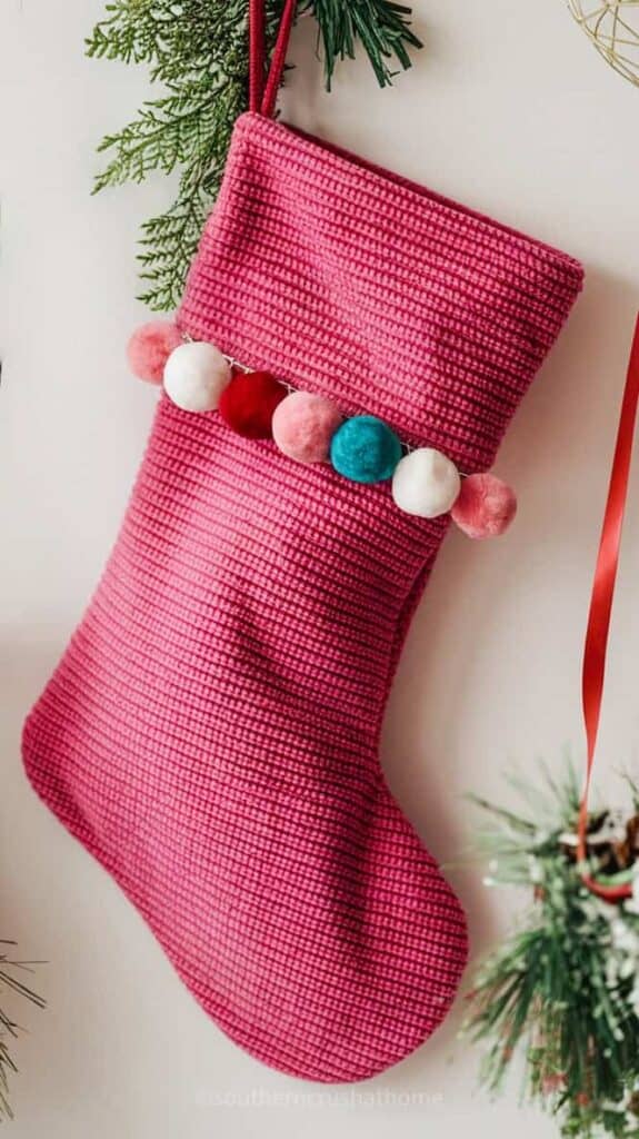 Make your stocking extra festive by decorating it with pom-poms! You can find inexpensive pom-poms at craft stores or make your own from yarn for a fun, colorful look.