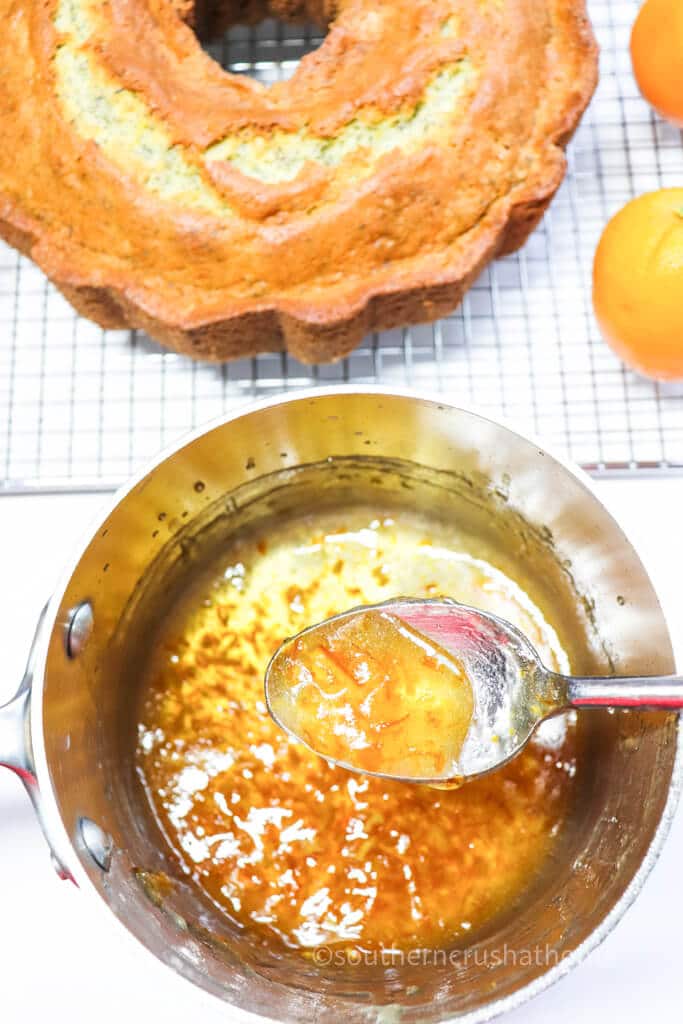 This is where it gets good! Sure poppy seed cake is delicious on it's own with just a hint of citrus, but adding this orange marmalade glaze really takes it over the top! This is a super simple recipe for orange marmalade glaze that you can actually use for even more delicious recipes during the holidays; including a delicious orange-glazed ham!