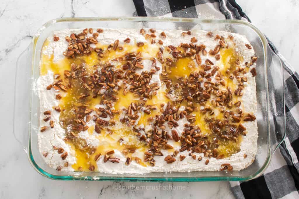 - Sprinkle cake mix over the top of the pumpkin mixture, and pat down. Do not mix! Sprinkle chopped pecans evenly over the cake mix, then drizzle with melted butter or add pats of butter.